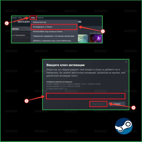 Запустите Steam -> Откройте меню «Игры» вверху клиента Steam -> Выберите пункт «Активировать в Steam...».