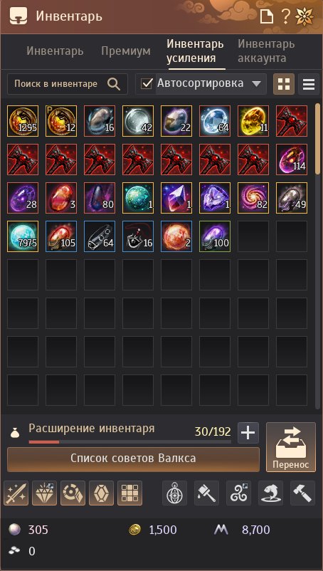 6) Материалы для усиления: большой запас, в т.ч. крон-камни (~7,9k) и набор советов/камней для усиления (см. вкладку «Инвентарь усиления»).