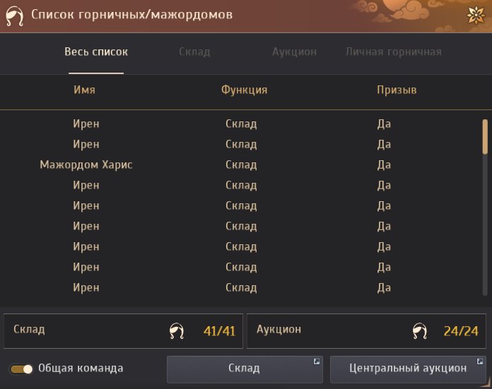 3) Горничные/мажордомы: 41 складских + 24 аукционных (итого 65) — моментальный доступ к складу/аукциону в любой точке.