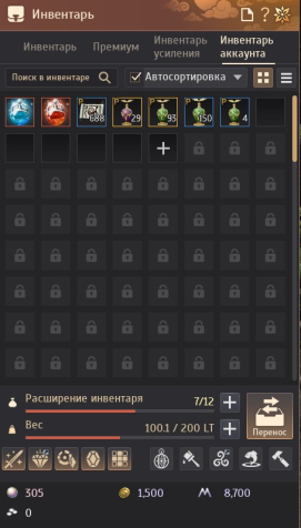 7) Инвентарь/персонаж: есть расширения инвентаря, базовый вес прокачан; премиальные предметы и валюты на скрине.