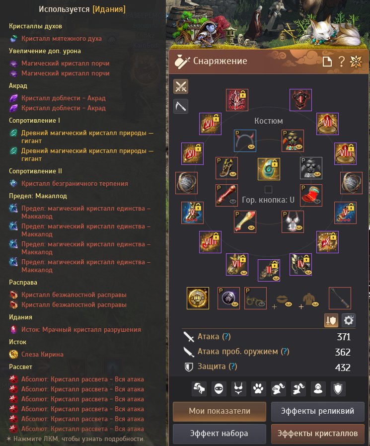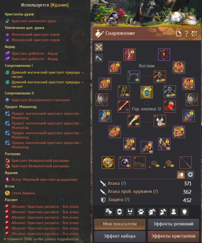 1) Статы: Атака 371, Атака проб. 362, Защита 432 (см. скрин со шмотом и кристаллами).
