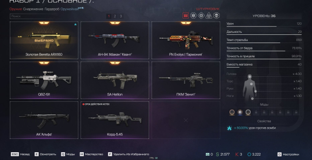 • штурмовик: золотая beretta arx160 (40 ур.), fn evolys гармония (112 ур.), qbz-191 (10 ур.), aн-94 абакан квант (35 ур.)
