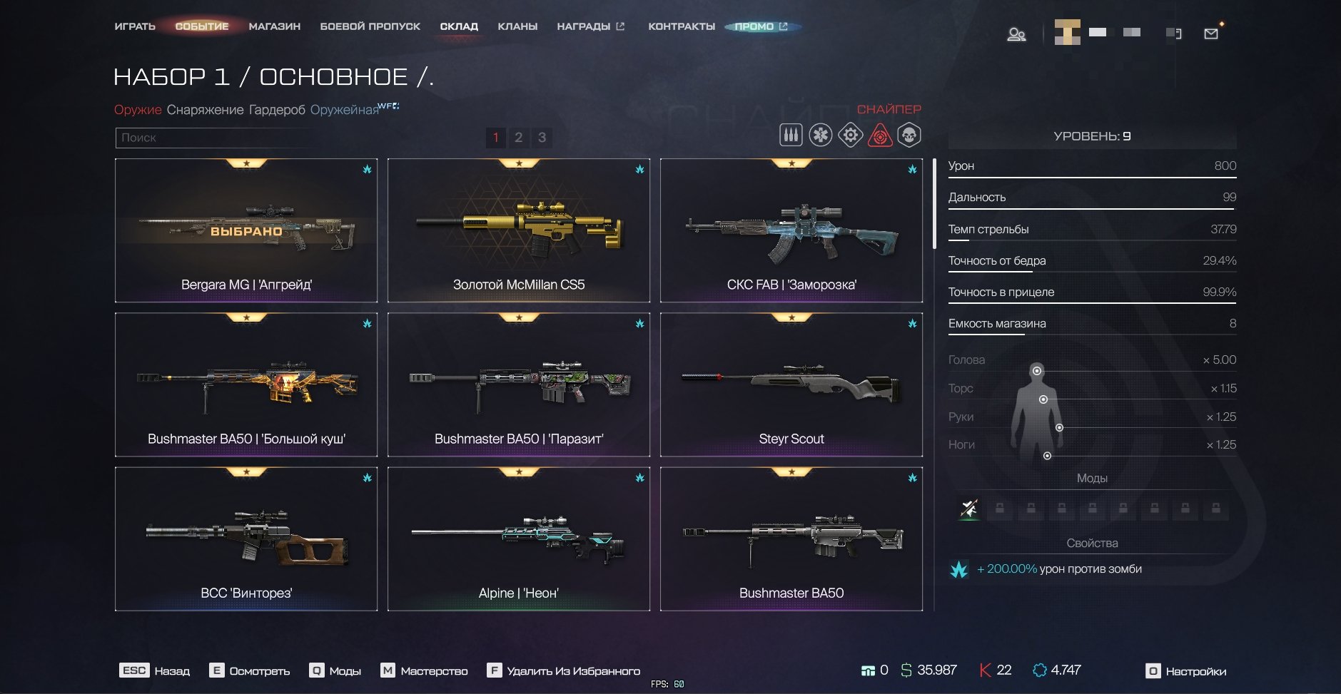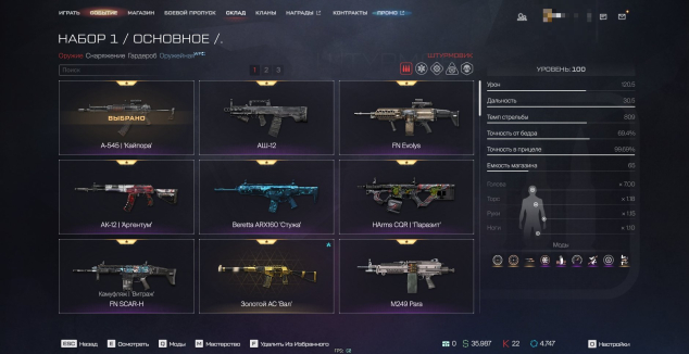 A-545 (100 уровень, 4 золотых мода + 5 фиолетовых), FN Evolys (107 уровень, 9 золотых модов), Аш-12 (27 уровень, золотой+фиолетовый мод), Harms CQR «Паразит» (4 уровень), Beretta ARX160 «Стужа» (23 уровень, 2 фиолетовых мода), M249 Para (32 уровень), Золотой Ас-Вал (10 уровень), Ак-12 «Аргентум» (7 уровень), FN-SCAR H (6 уровень), Корд-5.45 (31 уровень), HK 433 «Экспедиция» (4 уровень), ПКМ «Зенит» (6 уровень) + Много старых редких и золотых пушек (На видео которое выше все видно будет)