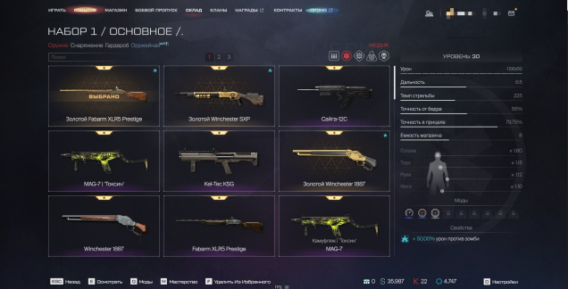 Золотой Fabarm XLR Prestige + Обычный (30 уровень, 2 синих мода), Золотой Winchester SXP (3 уровень), Золотой Winchester 1887 + Обычный + «Большой Куш» (8 уровень), Kel-Tec KSG (3 уровень), Mag-7 «Токсин» (7 уровень) + Много старых редких и золотых пушек (На видео которое выше все видно будет)