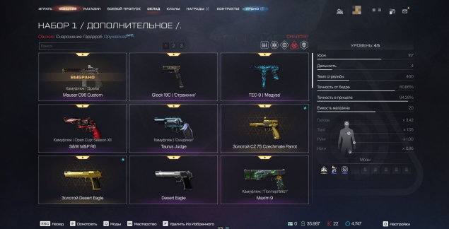 R8 (103 уровень, 9 белых модов), Золотой Desert Eagle + Обычный + «Драконоборец» (104 уровень, 2 синих мода + 7 белых), Mauser C96 Custom (43 уровень), Glock 18c + «Стражник» + «Гаргулья» (21 уровень) + Много старых редких и золотых пистолетов (На видео которое выше все видно будет)