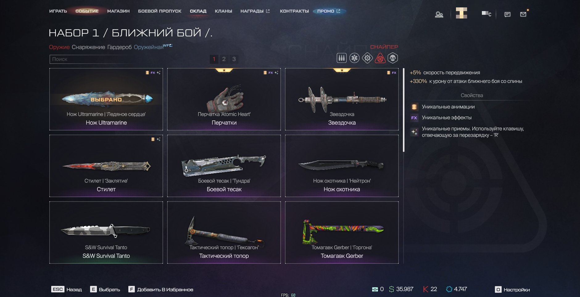 Перчатки «Atomic Heart», Нож Ultramarine «Ледяное Сердце», Звездочка, Стилет «Заклятие» + Много старых редких ножей