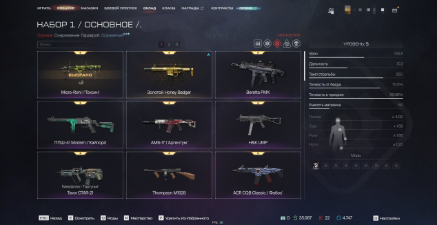 Золотой Honey Badger (3 уровень), Micro-Roni «Токсин» (5 уровень), АМБ-17 «Аргентум» (10 уровень), ППШ-41 Modern «Кайпора» (17 уровень), Tavor Ctar-21 (1 уровень) + Много старых редких (На видео которое выше все видно будет)