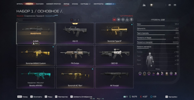 A-545 (102 уровень, 2 золотых мода + 7 фиолетовых), АШ-12 (46 уровень, 1 золотой мод + 3 фиолетовых), Золотой Type-97(5 уровень), Золотая M16a3 (12 уровень), FN Evolys (25 уровень, 2 синих мода), Beretta ARX160 (38 уровень, 2 золотых мода + 1 синий), Золотой Ас-Вал (30 уровень, 1 золотой + синий)