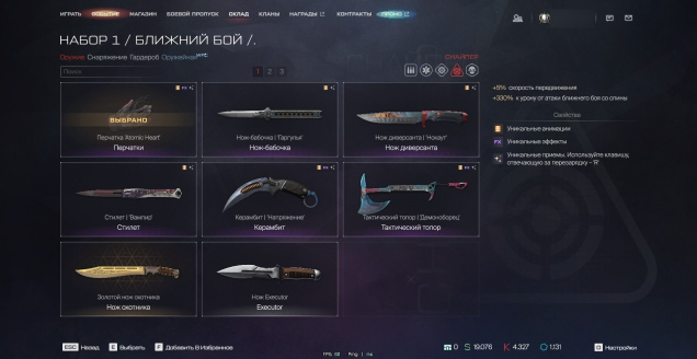 Перчатки «Atomic Heart», Керамбит «Напряжение», Стилет «Вампир», Тактический топор «Демоноборец», Нож бабочка «Гаргулья», Нож диверсанта «Нокаут», Золотой нож охотника,