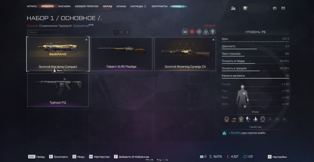 Золотой Kral Arms (73 уровень, 3 золотых мода + 2 синих), Fabarm XLR5 Prestige (31 уровень, 1 золотой мод + 2 фиолетовых), Золотой Browning (12 уровень)