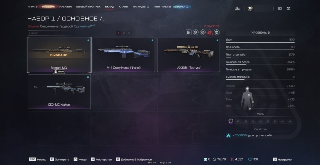 Bergara MG (9 уровень, 1 синий мод), АХ-308 «Тортуга» (19 уровень, 1 фиолетовый мод + синий)