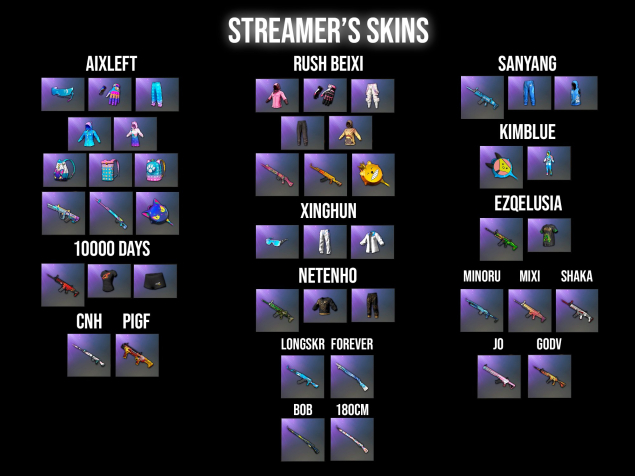 ➖ Наборы стримерской одежды и оружий «AixLeft», «10000 DAYS», «Rush BeiXi», «Xinghun», «Neteho», «SanYang», «KimBlue»;
