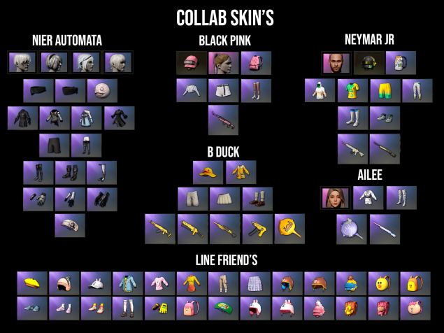 ➖ Коллаборации «Nier Automata», «BlackPink», «B-Duck», «Neymar JR.», «Ailee», «Line Friends».