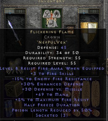 Краткое описание: flickering flame 8 aura/-15 res/69 mp in crown ROTW
