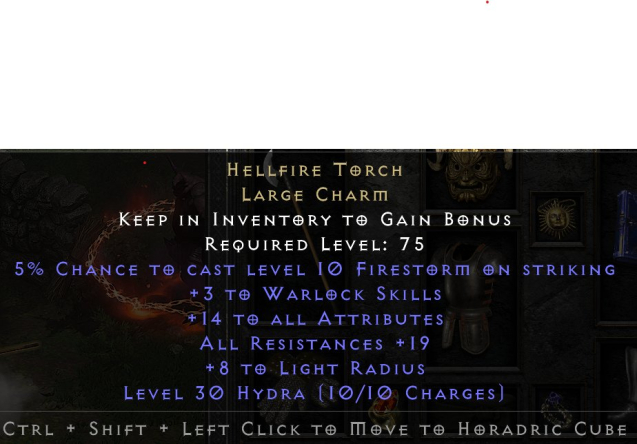 Краткое описание: Факел адского пламени +3 к скил Варлока / Торч / Hellfire Torch +3 Warlock Skills 14 attr \ 19 res