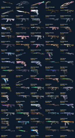 Champions 2024 Blade, Kuronami no Yaiba, Glitchpop Dagger, RGX 11z Pro Karambit, Mystbloom Kunai, Xenohunter Knife, Sovereign Sword, Spectrum Classic, Champions 2023 Vandal, Champions 2024 Phantom, Evori Dreamwings Vandal, Kuronami Vandal, Kuronami Sheriff, Kuronami Marshal, Kuronami Spectre, Sentinels of Light Sheriff, Prelude to Chaos Vandal, Sentinels of Light Vandal, Mystbloom Phantom, Neo Frontier Sheriff, Sentinels of Light Phantom, Mystbloom Judge, Ion Spectre, Valiant Hero Vandal, Sovereign Marshal, Reaver Vandal, Valiant Hero Ghost, Gaia's Vengeance Vandal, XERØFANG Ghost, Prime//2.0 Phantom, Avalanche Phantom, Bound, Bulletbox Bucky, Bulletbox Frenzy, Tilde Operator, Iridian Thorn Bucky, Mystbloom Sheriff, Iridian Thorn Sheriff, Moondash Marshal, Fiber Optic Ghost, Comet Odin, Hieroscape Ares, Bound Classic, Starlit Odyssey Guardian, Guardrail Frenzy,Tacti-Series Frenzy, Divergence Staff, Blush Guardian, Celestia Ghost, Snakebite Shorty, Overlay Sheriff, Divergence Operator, Comet Spectre, Rune Stone Bulldog, Tilde Bulldog, Finesse Classic, Moon Scout Guardian, Divergence Judge, Bound Bulldog, Hieroscape Frenzy, Gridcrash Judge, Moondash Frenzy, Game Over Sheriff, Rune Stone Marshal, Topotek Ghost, Divergence Vandal, Comet Ghost, Rune Stone Shorty, Digihex Ares, Topotek Phantom, Torque Classic, Digihex Bulldog, Guardrail Vandal, Comet Vandal, Composite Stinger, Venturi Marshal, Comet Sword, Tacti-Series Classic, Guardrail Guardian, Torque Operator, Moon Scout Outlaw, Retrowave Sheriff, Tactiplay Odin, Nanobreak Judge, Cloudweaver Stinger, Moondash Stinger, 9 Lives Guardian, Divergence Classic, Venturi Frenzy, Venturi Vandal, Composite Phantom, Iridian Thorn Judge, Tactiplay Phantom, Gridcrash Bulldog, Tilde Knife, Rune Stone Odin, Digihex Ghost, Moon Scout Sheriff, Composite Marshal, Bulletbox Guardian, Composite Sheriff, Flutter Ghost, Torque Coiler, Starlit Odyssey Vandal, Bulletbox Bulldog, Moondash Guardian, Iridian Thorn Blade, Signature Sheriff, Signature Stinger, Iridian Thorn Operator, Monstrocity Vandal, Hush Ghost, Nanobreak Sheriff, Signature Guardian, 9 Lives Ares, Blush Frenzy, Hieroscape Phantom, Gridcrash Stinger, Solarex Sheriff, Cloudweaver Outlaw, Mystbloom Operator, Tacti-Series Guardian, Immortalized Sheriff, Hieroscape Bulldog, Starlit Odyssey Ghost, Tilde Shorty, Signature Marshal, Celestia Stinger, Venturi Knife, Tactiplay Bulldog, Composite Knife, Nanobreak Odin, Bound Judge, Torque Spectre, Tactiplay Stinger, 9 Lives Classic, Digihex Judge, Topotek Odin, Starlit Odyssey Spectre, Bound Phantom, Monstrocity Ares, Celestia Spectre, Venturi Spectre, Moon Scout Bucky, Monstrocity Sheriff, Topotek Bucky, Monstrocity