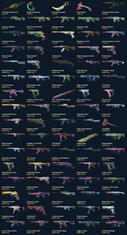 Champions 2023 Kunai, Blades of Imperium, Prime//2.0 Karambit, Gaia's Wrath, Champions 2023 Vandal, Imperium Operator, RGX 11z Pro Phantom, Imperium Vandal, Imperium Judge, BlastX Phantom, Ruination Phantom, Imperium Sheriff, Sovereign Ghost, Magepunk Vandal, Gaia's Vengeance Vandal, Reaver Vandal, Reaver Sheriff, Prime Vandal, Gaia's Vengeance Ghost, Prime Classic, Panoramic Bucky, Striker Classic, Wayfinder Shorty, Blush Operator, Transition Vandal, 9 Lives Phantom, Divine Swine Judge, Striker Spectre, Digihex Bulldog, .SYS Bucky, Transition Stinger, Coalition: Cobra Frenzy, VCT LOCK//IN Misericórdia, Divine Swine Frenzy, Blush Frenzy, Composite Phantom, Lycan's Bane Ghost, Composite Marshal, Gridcrash Ghost, 9 Lives Ares, Freehand Odin, Wayfarer Sheriff, Venturi Vandal, Divine Swine Marshal, .SYS Melee, Blush Guardian, Coalition: Cobra Odin, .SYS Stinger, Striker Knife, Striker Bulldog, Panoramic Guardian, .SYS Vandal, Coalition: Cobra Marshal, Venturi Marshal, Hue Shift Bulldog, RagnaRocker Frenzy, Composite Stinger, Hue Shift Shorty, Blush Spectre, Venturi Frenzy, Hue Shift Phantom, Freehand Ghost, Hue Shift Spectre, Gridcrash Stinger, Coalition: Cobra Judge, Composite Sheriff, Gridcrash Judge, Striker Operator, Digihex Ares, Divine Swine Ares, Freehand Spectre, .SYS Sheriff, 9 Lives Guardian, Venturi Spectre, Panoramic Classic, Lycan's Bane Vandal, Lycan's Bane Odin, Lycan's Bane Stinger, Digihex Judge, Gridcrash Bulldog
