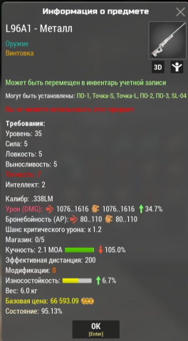 Сервер: RU-1Краткое описание: L96 M8 Металл 34.7% (1076-1616), -105% (2.1 MOA), +6.7% Износ (Любой сервер)