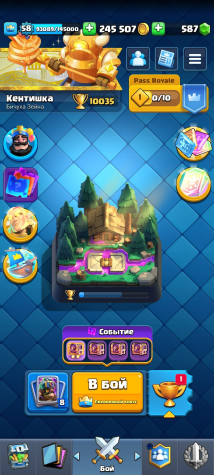🏆10035🏆🔴14 ЭВОЛЮЦИЙ 3-16, 2-15, 6-14 ЛВЛ🔴587💎🔴6 СКИНОВ НА БАШНЮ🔴ПИН С МИМИМИ🔴, 25 арена, 58 уровень, 10035 кубков, 121 карт, Нет