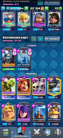 9000🏆55 УРОВЕНЬ📶121/121 КАРТ🌟3 СКИНА НА БАШНЮ🏰60 ЭМОДЗИ🪙2шт-16СИЛ,3шт-15СИЛ,4шт-14СИЛ💪7 ЭВО👾, 23 арена, 55 уровень, 9000 кубков, 121 карт, 21 лег, Ест