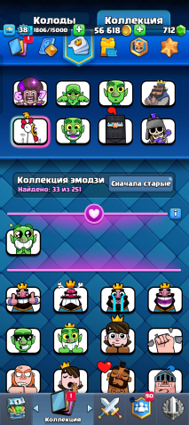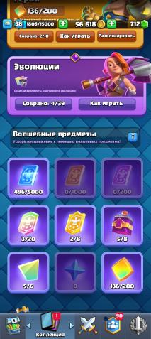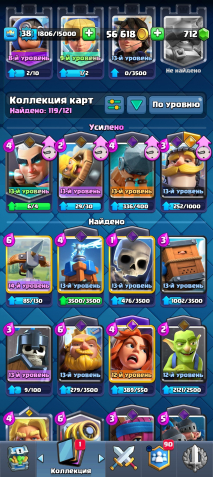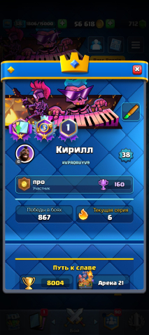 ⚡️【• 4 𝑬𝑽𝑶•】🏆 8004 КУБКОВ【 👤 】119 / 121【 💛 • 6 ЧЕМП • 20 】【 💎 712 • 🟡 • 56К】, 21 арена, 38 уровень, 8004 кубков, 119 карт, 20 лег, Есть