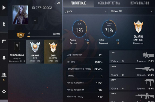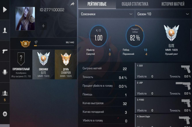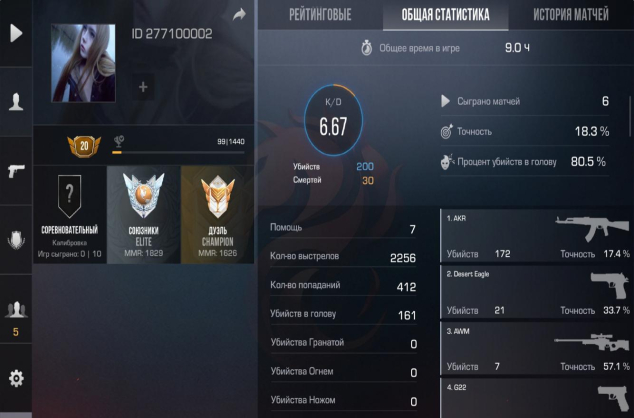 У аккаунта очень «чистая» и мощная стата. На каждые 30 смертей приходится 200 убийств! Процент попаданий в голову — 80.5%. Все будут думать, что ты профи или киберспортсмен.