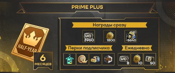 〚🤍〛𝟏. Подписка «Премиум+» (на 6 месяцев): сразу после активации вы получите 3960 UC, 1800 очков RP и предметы на 8640 UC по внутриигровой почте. Остальные награды забирайте каждый день во вкладке «Спецпредложения» → «Подписки».