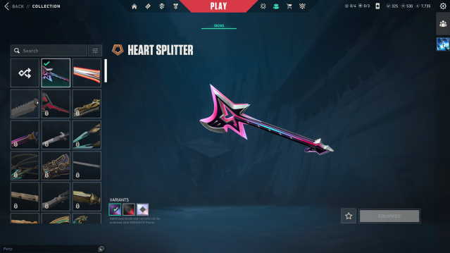 Скины: Interhelm Sword, Heart Splitter, Origin Vandal, Interhelm Classic, Interhelm Phantom, Heartstopper Vandal, Interhelm Judge, Heartstopper Ghost, Interhelm Marshal, Final Chamber Classic, Heartseeker Stinger, Heartseeker Outla, Haloform Frenzy, Wayfarer Sheriff, Heartbreaker Operator, Heartbreaker Sheriff, Belaflaire Bucky, Belaflaire Spectre, Haloform Ares, Heartbreaker Odin, Heartseeker Shorty, Haloform Guardian, Starlit Odyssey Ghost, Heartseeker Guardian, Belaflaire Vandal, Haloform Operator, Belaflaire Ghost, Heartbreaker Bulldog, Heartseeker Phantom
