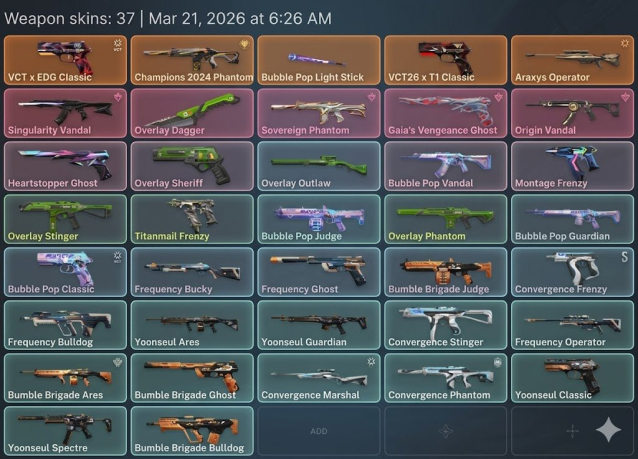 📕 | Скины: Classic «VCT x EDG» | Phantom «Champions 2024» | Classic «VCT26 x T1» | Operator «Араксис» | Vandal «Сингулярность».