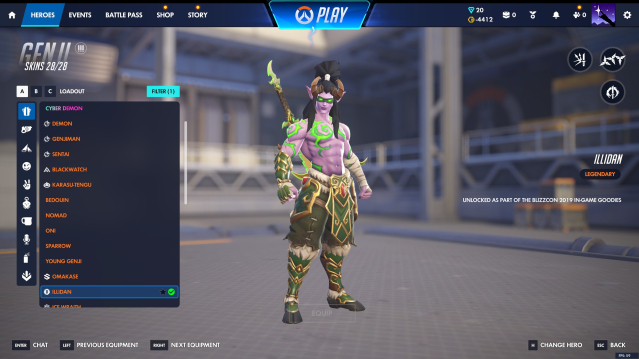 Unique Skins: Illidan Genji, Tyrande, Marammat Symmetra; Noire, Kerrigan Widow; Brick Bastion, Comic Book Tracer, General Doomfist, Pachimari Roadhog, Dr. Ziegler Mercy, Demon Hunter, Jester Sombra