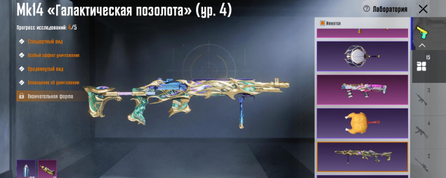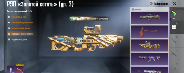 Mk14 Галактическая позолота 4 лвл, P90 Золотой коготь 3 лвл, ДБС 3 лвл, ТОМПСОН 3 лвл, Бизон 3 лвл, M762 8-битный пони 2 лвл, Сковорода 2 лвл, Томагавк 2 лвл, 15 оружий