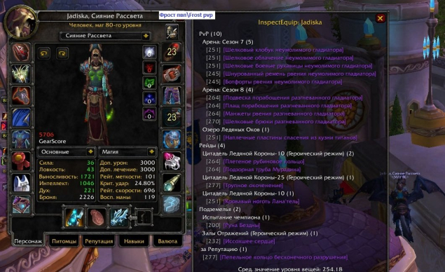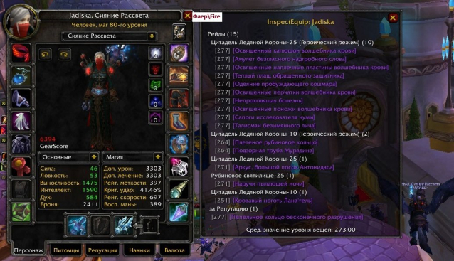 3) Маг, человек. Фаер 6.4 + а7-а8 фрост маг. Инженероное дело (гоблинская инженерия) + портной (мастер по огненной ткани). Выбиты поводья Непобедимого и кодо Хмельного Фестиваля.