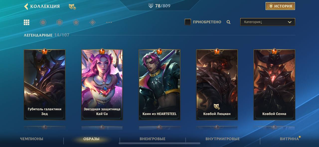 ЛЕГЕНДАРНЫЕ (14):  губитель галактики зед, звездная защитница кай са, каин из heartsteel, ковбой люциан, ковбой сенна,  ковбой эш, король бог дариус, король бог гарен, кулак бога ли син, предвестник зари енэ,  предвестник ночи ясуо, предвестница зари ривен, проект пайк, темная космическая люкс.