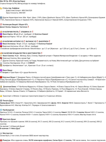 ℹ️ Другие Характеристики: Маг. Крит. Шанс. 218%, Шанс Двойного Урона 157%, Шанс Тройного Урона 69%, Блокировка Оружия 176%, Увеличение Урона от Оружия 310%, Увеличение Урона от Умений 439%, Сопротивление Оглушению 170%.