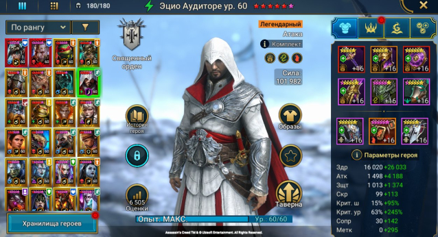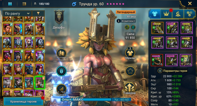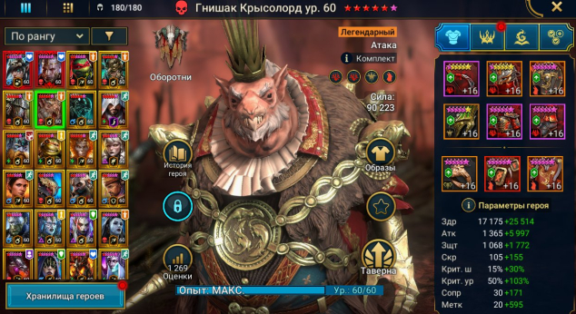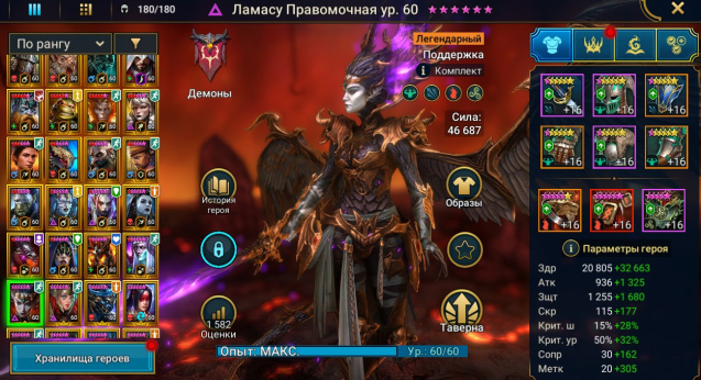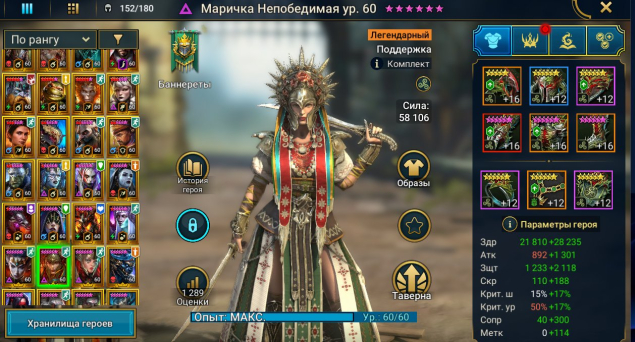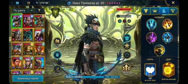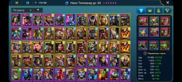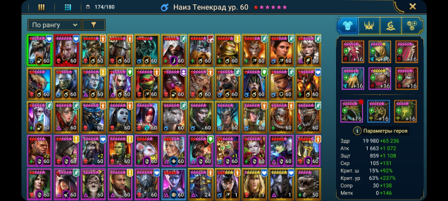 Наиз , Маричка, Эмбрис, сенна (387 СКР) , лилиту, пифион, гнишак, арманз, мифических героев: 2, легендарных героев: 60, эпических героев: 130, уровень