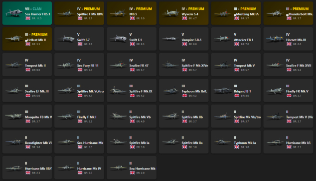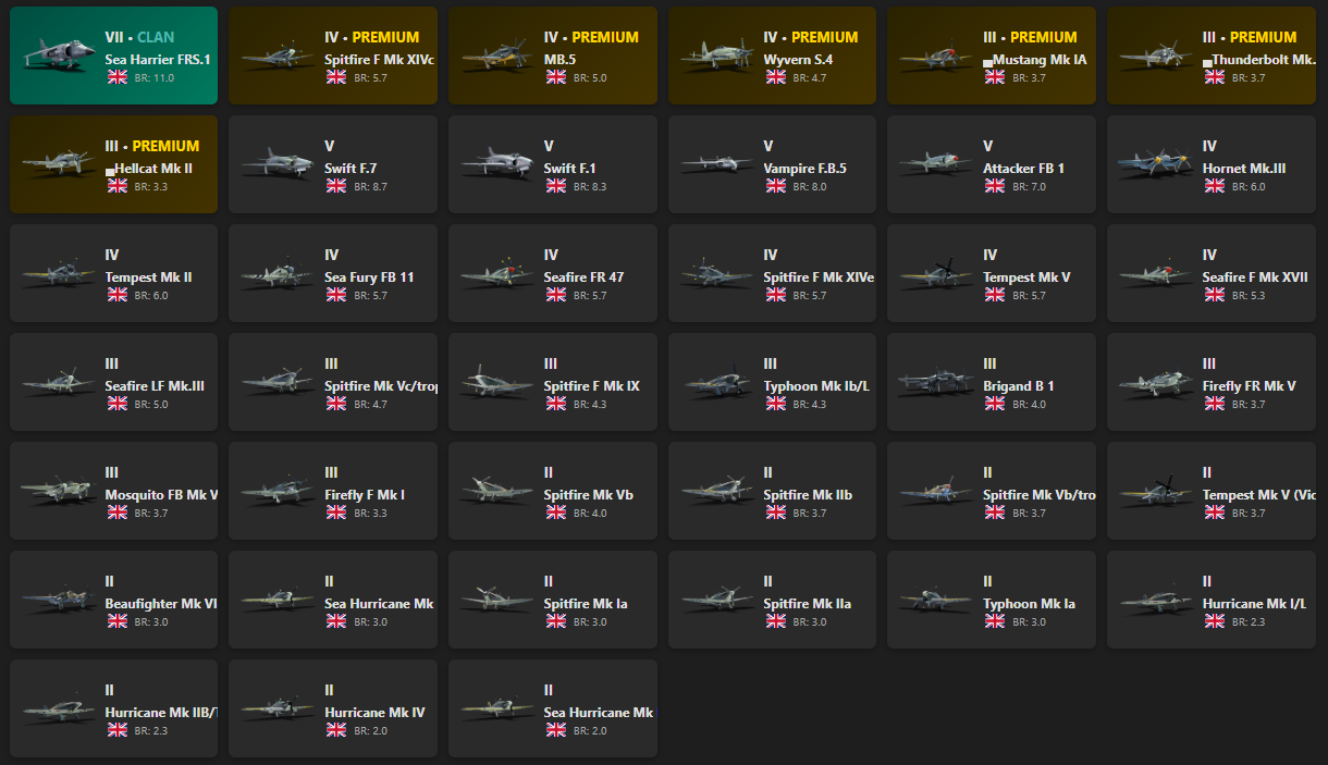 VII - 1, V - 4 Sea Harrier FRS.1, Spitfire F Mk XIVc, MB.5, Wyvern S.4, Mustang Mk IA, Thunderbolt Mk.1, Hellcat Mk II