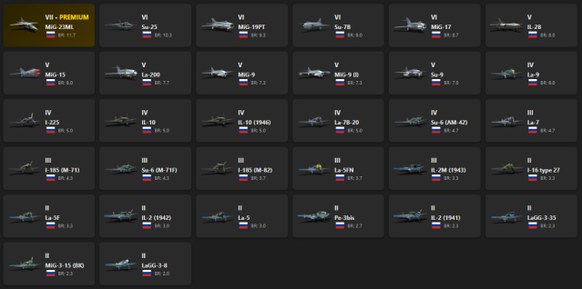 VII - 1, VI - 4 MiG-23ML, Su-25, MiG-19PT, Su-7B, MiG-17, IL-28, MiG-15, La-200, MiG-9, MiG-9 (l), Su-9, I-225