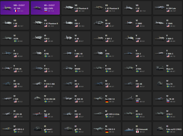 VIII - 1, VII - 7 F-16A, MiG-25PD, F-4J Phantom II, F-4E Phantom II, F-5E, A-10A Late, F-8E, F8U-2, AV-8C