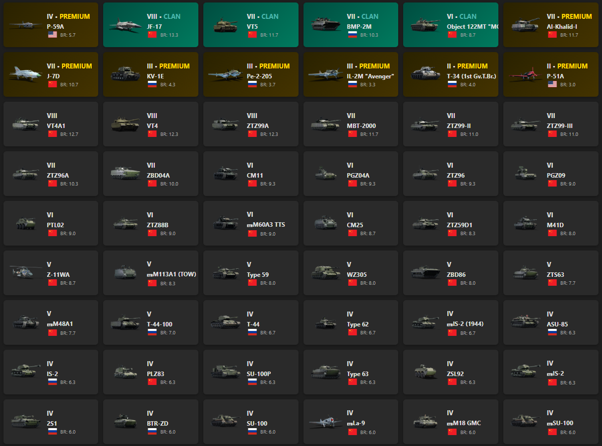 VIII - 4, VII - 9 JF-17, VT5, Object 122MT "MC", Al-Khalid-I, J-7D, KV-1E, VT4A1, VT4, ZTZ99A