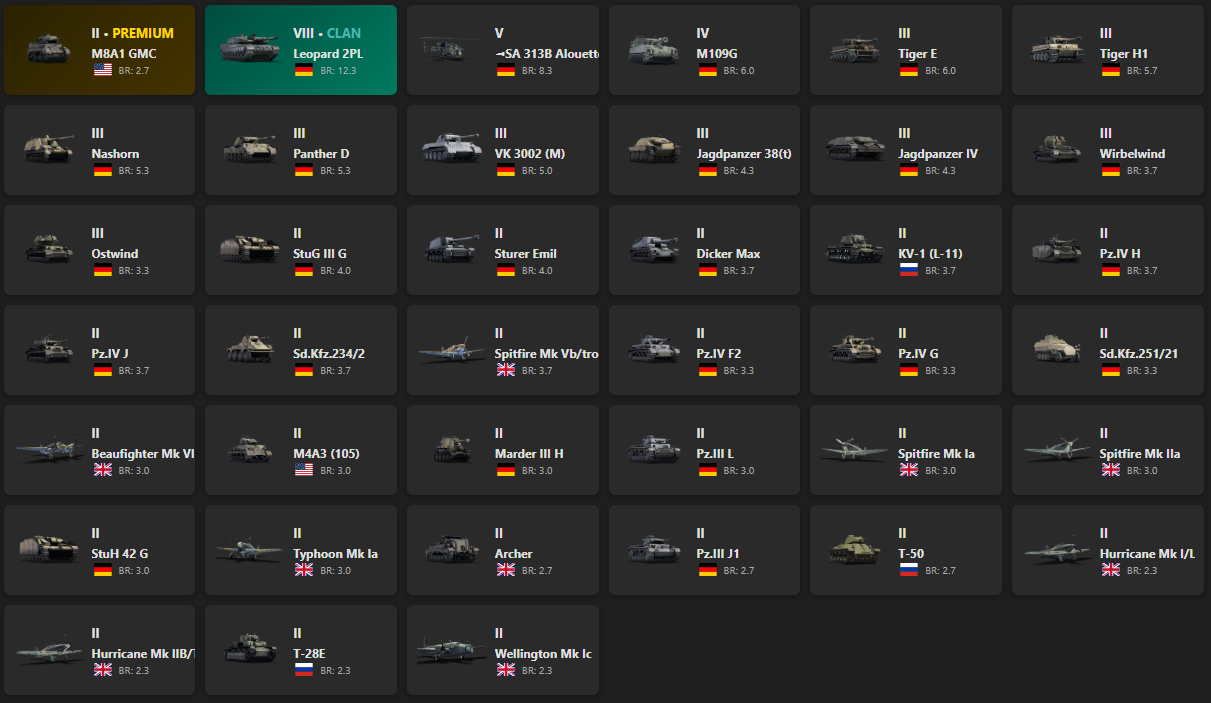 VIII - 1, V - 1 Leopard 2PL, SA 313B Alouette II, M109G, Tiger E, Tiger H1, Nashorn, Panther D, VK 3002 (M)