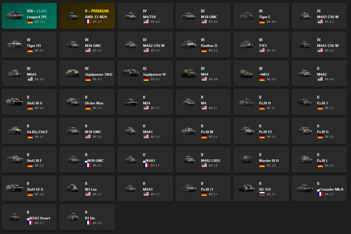 VIII - 1 Leopard 2PL, AMX-13-M24, M4/T26, M18 GMC, Tiger E, M4A3 (76) W, Tiger H1, M36 GMC, M4A2 (76) W