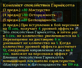 Раз в 1 сек. находясь в бою носитель получает эффект Эхо спокойствия Гарнекотта длительностью 15 сек., уровень эффекта теряется при преодолении каждых 7 м. дистанции. При входе в бой носитель получает 4 бонусных уровней эффекта. Когда уровень эффекта достигает 12, следующая направленная атака наделит носителя эффектом Влияние спокойствия Гарнекотта на 8 сек., повышающим характеристики Мастерство на +200 и Беспощадность на +200.