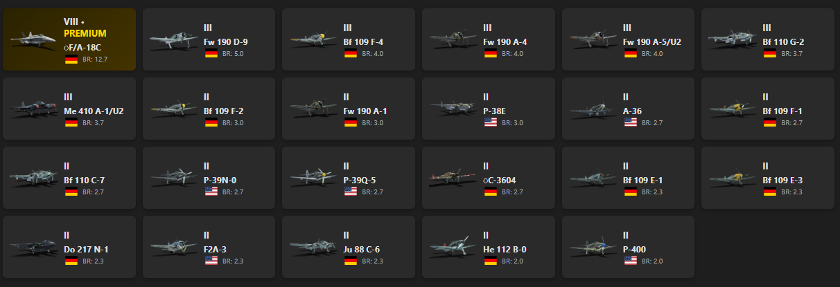 VIII - 1 F/A-18C, Fw 190 D-9, Bf 109 F-4, Fw 190 A-4, Fw 190 A-5/U2, Bf 110 G-2, Me 410 A-1/U2