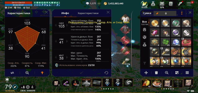 ℹ️ Другие Характеристики: Крит Атака 135%, Шанс Двойного Урона 111%, Шанс Тройного Урона 15%, Увеличение Урона от Оружия 179%, Увеличение Урона от Умений 165%, сопрот оглушения 75%