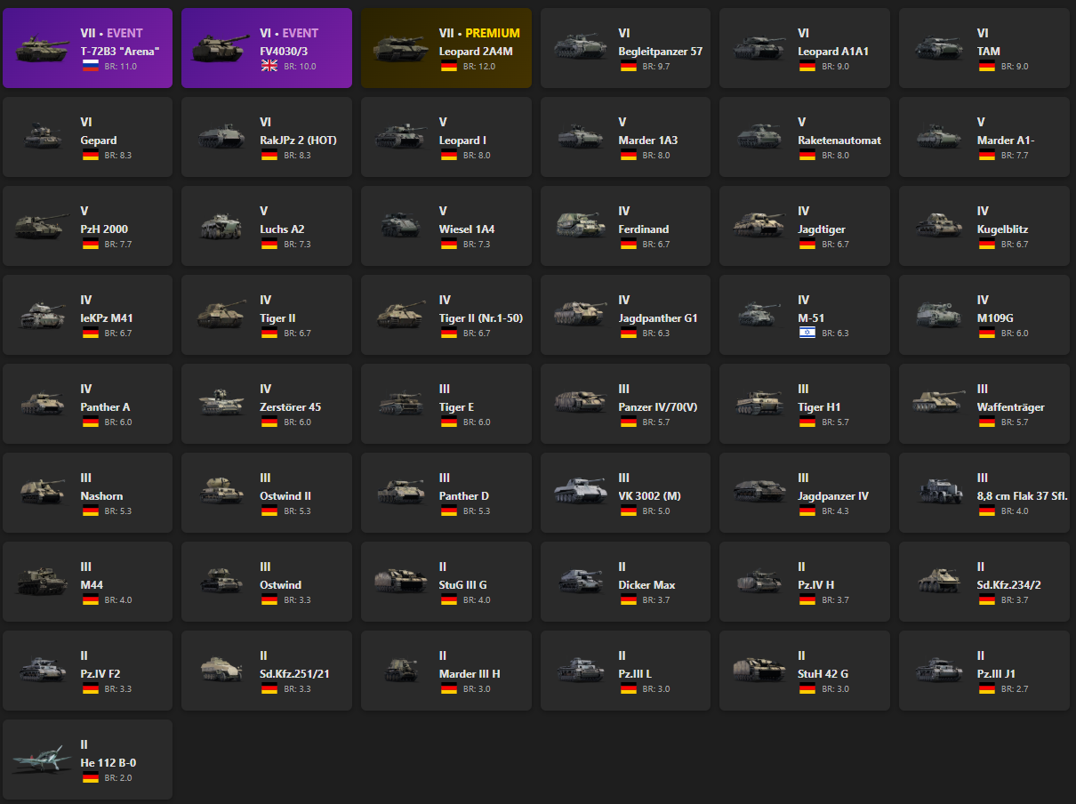 VII - 2, VI - 6 T-72B3 "Arena", FV4030/3, Leopard 2A4M, Begleitpanzer 57, Leopard A1A1, TAM, Gepard, RakJPz 2 (HOT)
