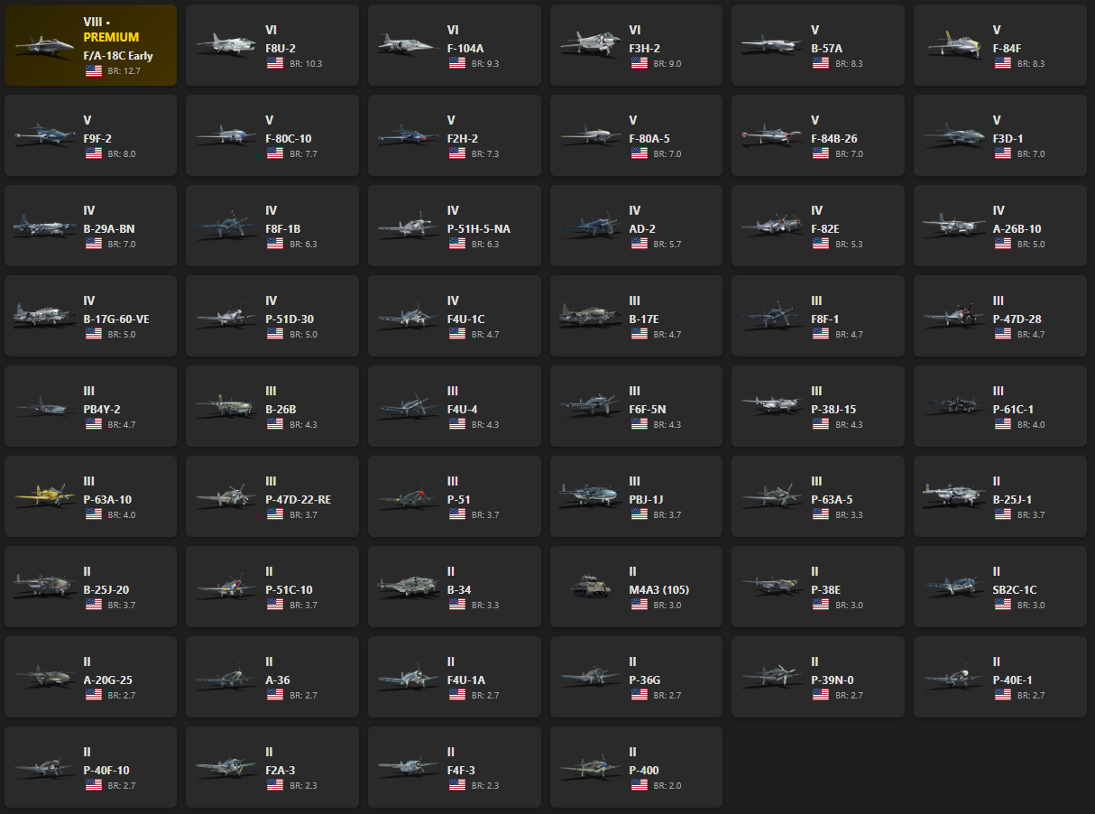 VIII - 1, VI - 3 F/A-18C Early, F8U-2, F-104A, F3H-2, B-57A, F-84F, F9F-2, F-80C-10, F2H-2, F-80A-5, F-84B-26