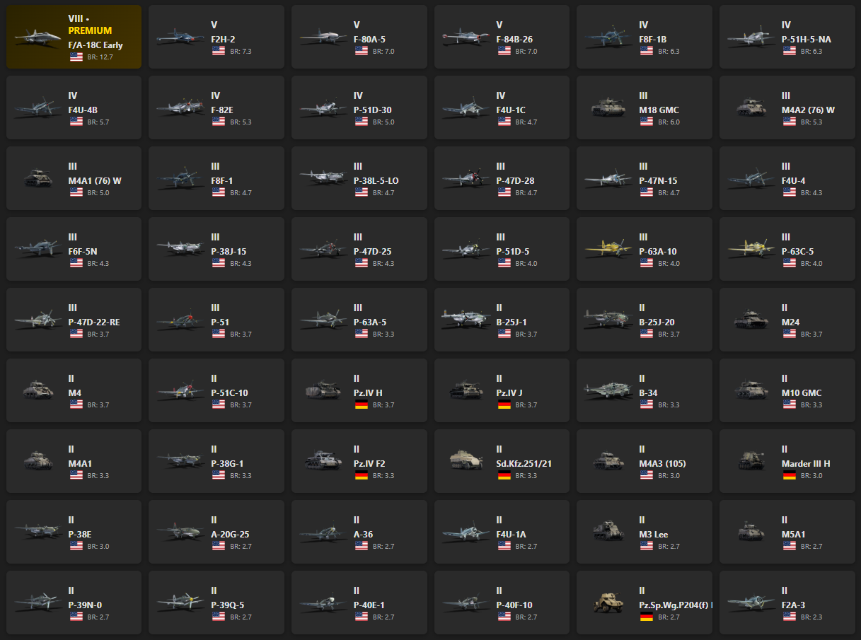 VIII - 1, V - 3 F/A-18C Early, F2H-2, F-80A-5, F-84B-26, F8F-1B, P-51H-5-NA, F4U-4B, F-82E, P-51D-30, F4U-1C