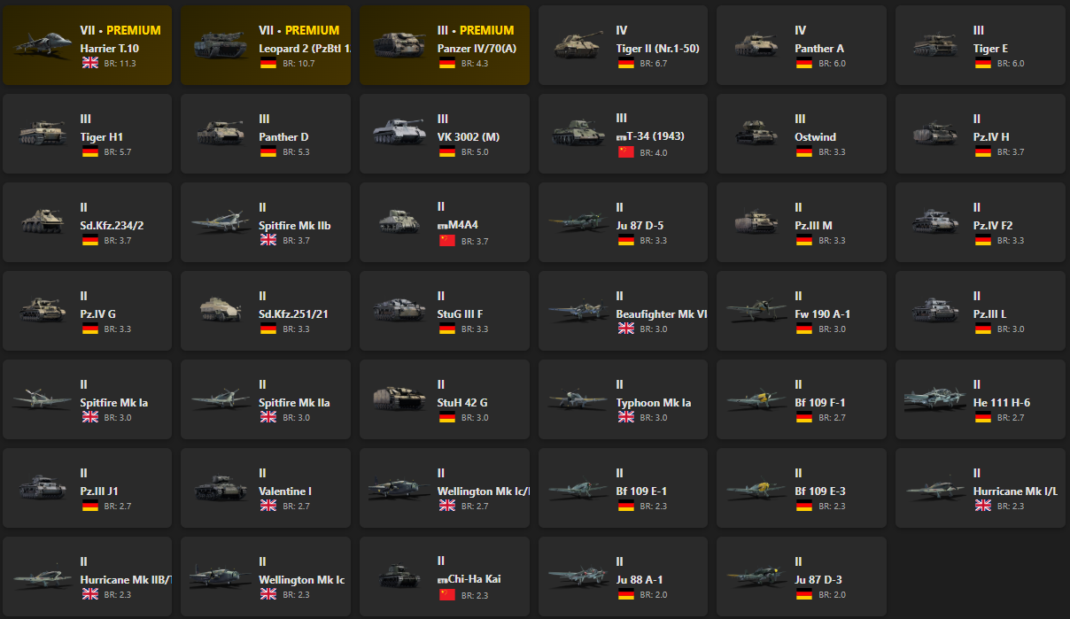 VII - 2 Harrier T.10, Leopard 2 (PzBtl 123), Panzer IV/70(A), Tiger II (Nr.1-50), Panther A, Tiger E, Tiger H1