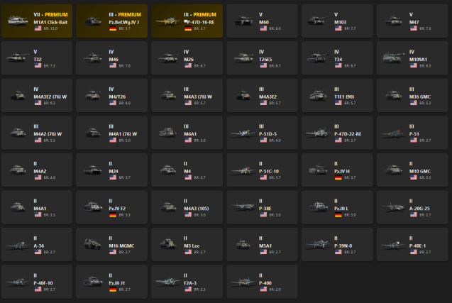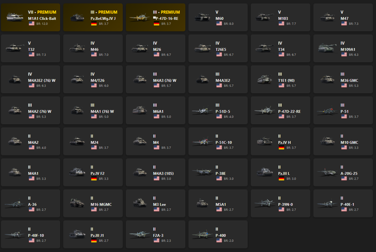 VII - 1, V - 4 M1A1 Click-Bait, Pz.Bef.Wg.IV J, P-47D-16-RE, M60, M103, M47, T32, M46, M26, T26E5, T34, M109A1