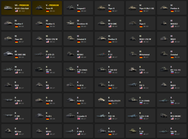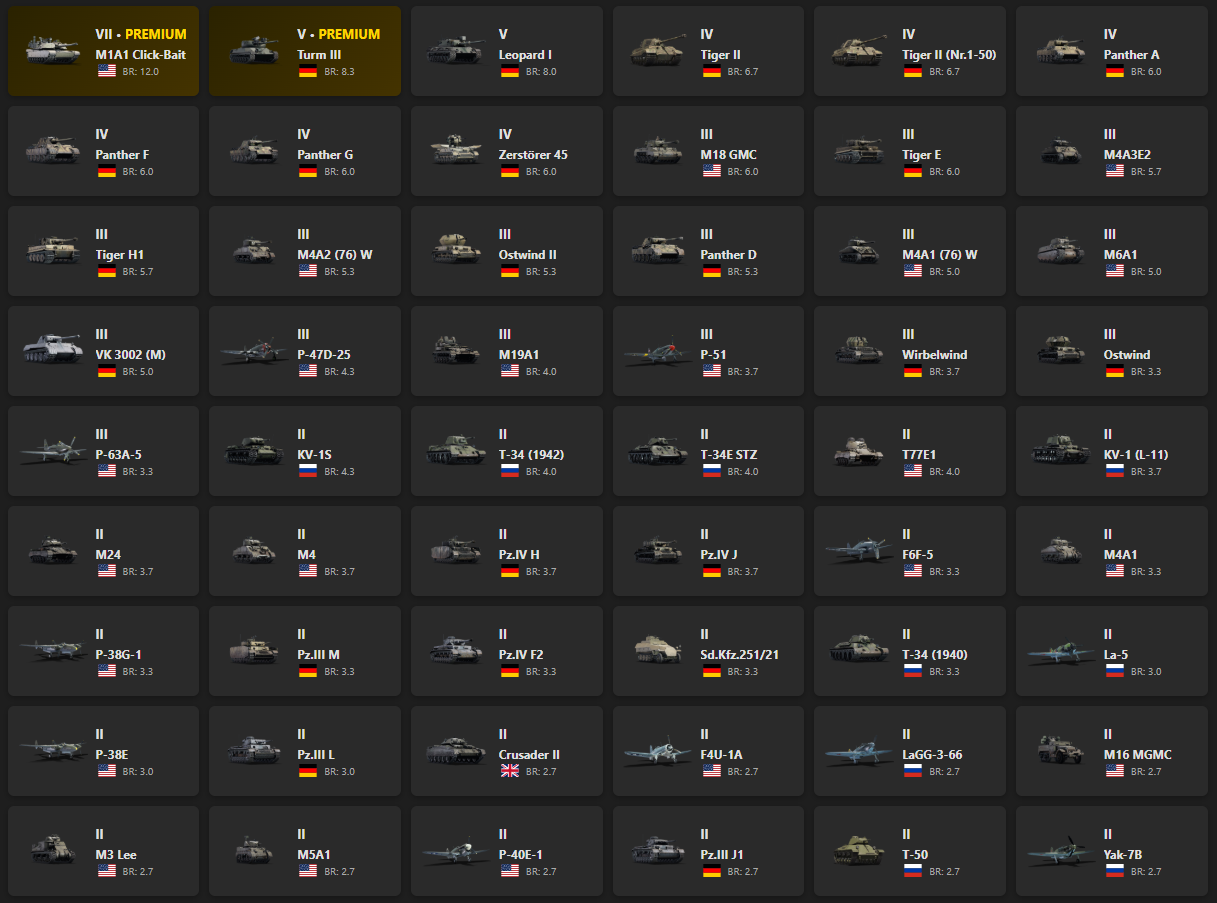 VII - 1, V - 2 M1A1 Click-Bait, Turm III, Leopard I, Tiger II, Tiger II (Nr.1-50), Panther F, Zerstörer 45